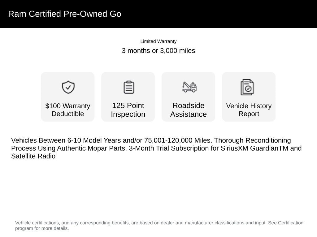 * Vehicles Between 6-10 Model Years and/or 75,001-120,000 Miles. Thorough Reconditioning Process Using Authentic Mopar Parts. 3-Month Trial Subscription for SiriusXM GuardianTM and Satellite Radio